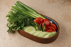 Свежие овощи: помидоры, огурцы, зеленый лук, перец и зелень — 200г